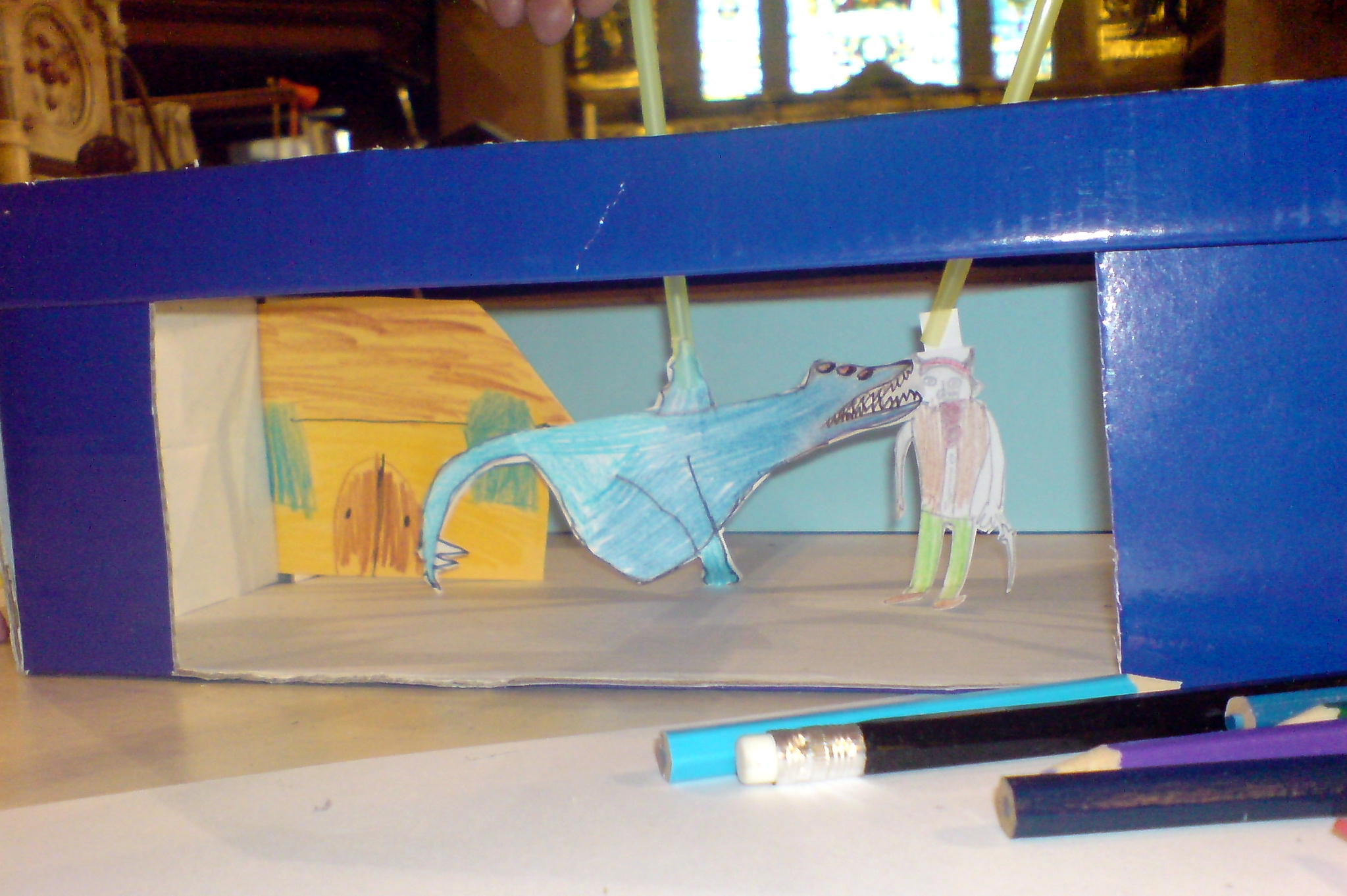 As I my last few posts have been of the exceedingly wordy variety, I feel justified in making this blog very “picturey”.  As I’ve mentioned previously, I went to Buxton for their puppet festival on Saturday the 30th of July.  A small but very artistic bunch of children and parents created these fantastic shoe box toy theatres with me in only an hour and a half!  My hope is that they will be able to create more characters, scenery and stories for the theatres, having had this exceedingly good start.