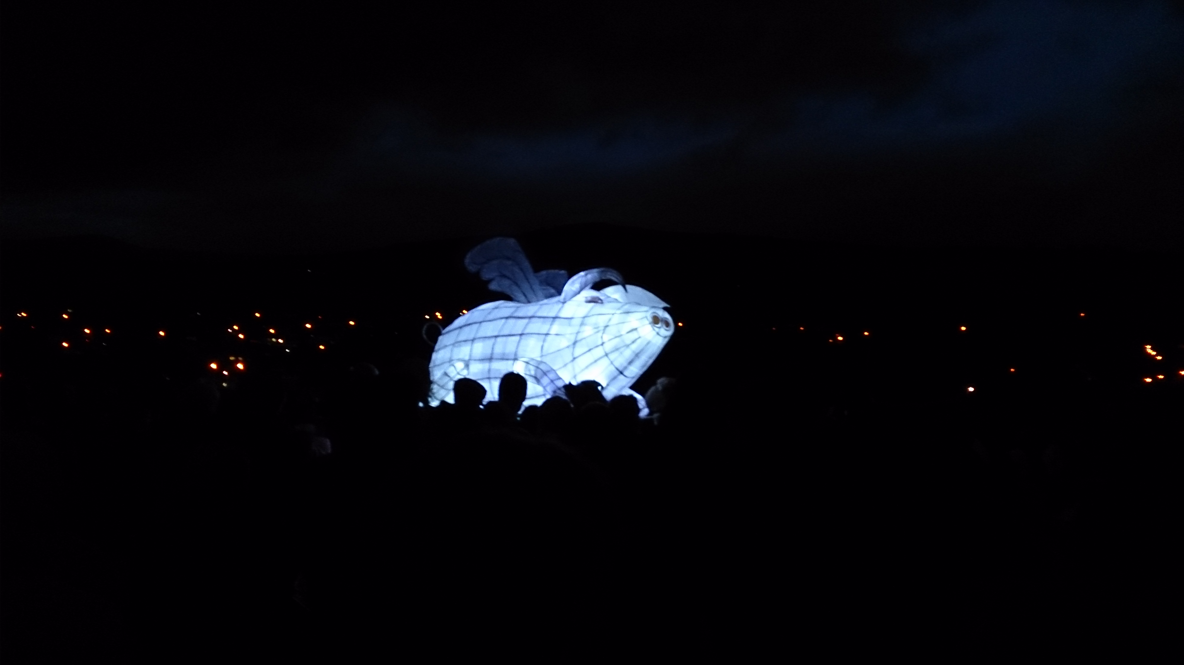 A Big lantern pig accompanied by drummers processes round the circle of people