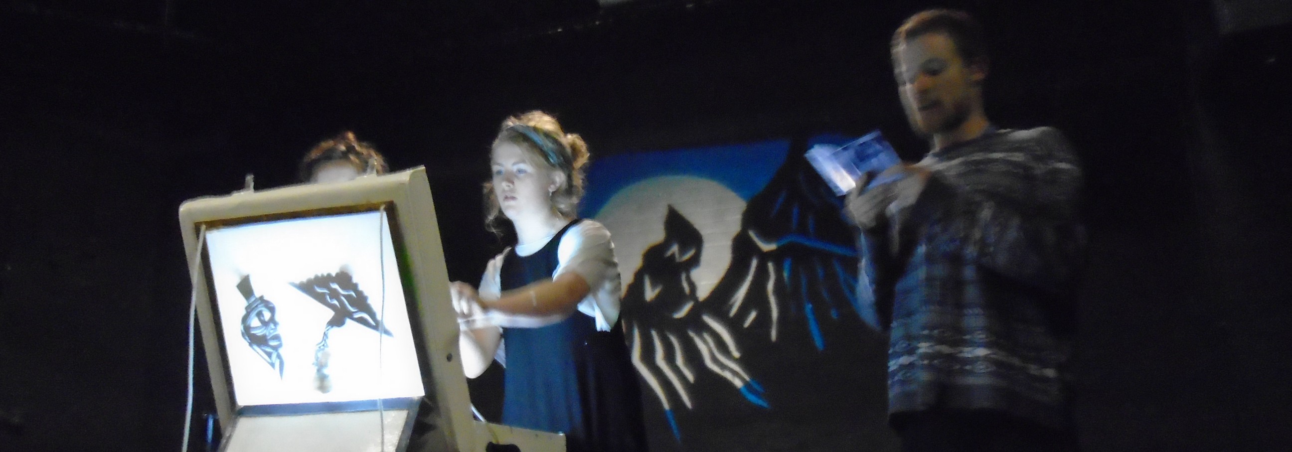 Having had all that inspiration the students had the rest of the three days to create their own short shadow puppet performance which they would perform with the suitcase theatre.  Jemima and Freddy both chose nonsense poems as inspiration and Jo picked a short poem by Robert Louis Stevenson from a book I’d brought to give them ideas, while Seb decided to make a shadow puppet play out of an environmentally themed piece that he had written previously.  They all did excellent work and performed their shows for some of the other students on the Friday, (all of whom seemed very impressed and well entertained).  All of the students helped each other to perform their shows rather than choosing to create shows where they were being entirely self-sufficient.  This gave them greater scope for creativity, more challenging lighting and sound effects.  You can see photo’s of their work below: