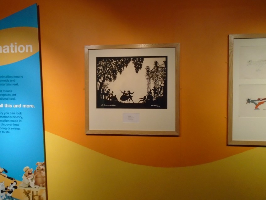 An actual original paper cut by Lotte Reiniger. If you look at the tree in the top left hand corner you can see some damage which shows that it is paper rather than a black and white print and perhaps you can just about see a shadow too.