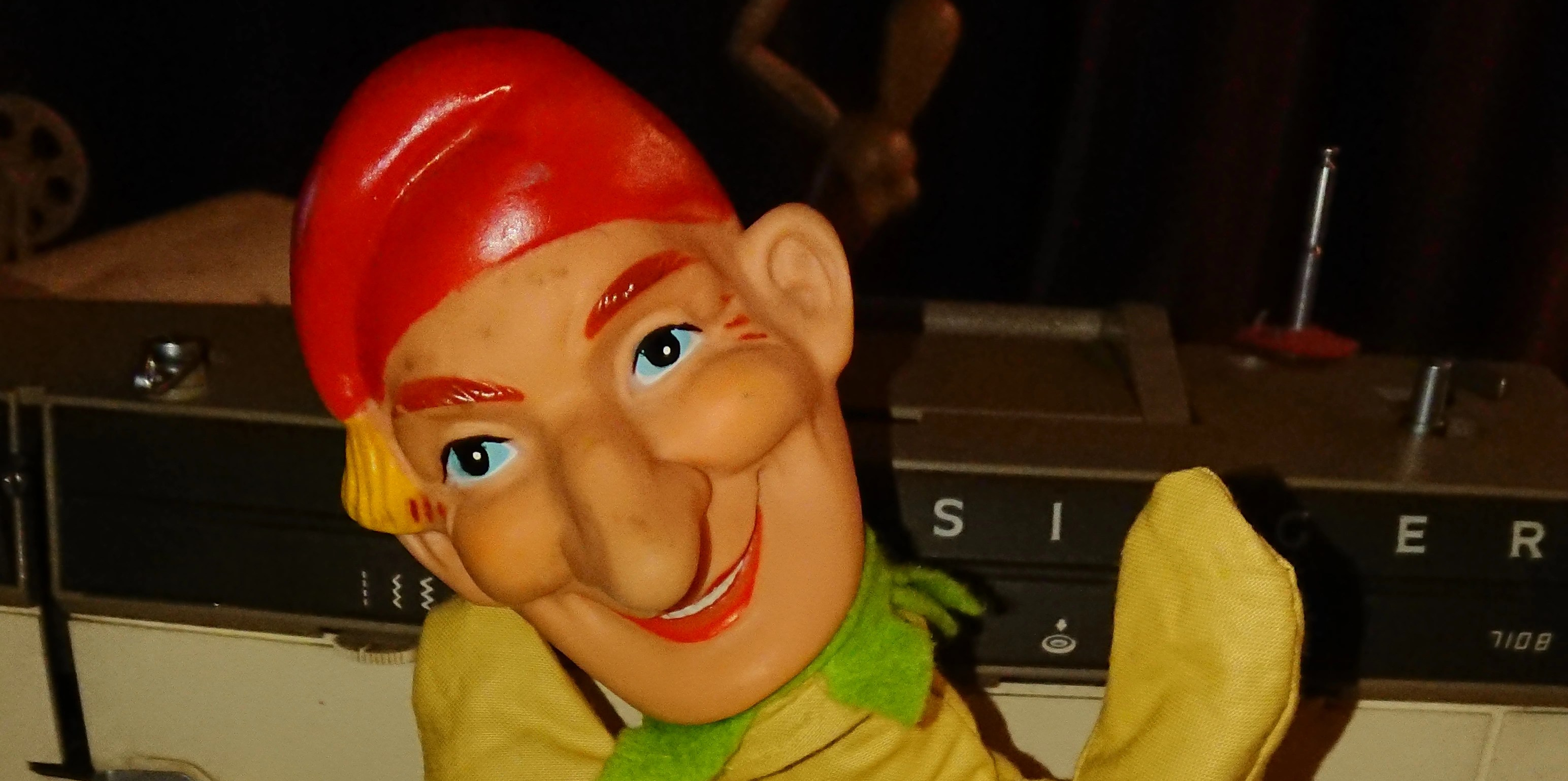 Amongst other things, I found this old vinyl toy puppet head of Mr. Punch. My mum got him for me from a charity shop a very long time ago and he originally had a very simple two coloured fabric body with some fabric “buttons” up the front. After a while the stitching failed and Mr. Punch’s body came off and then went missing altogether.