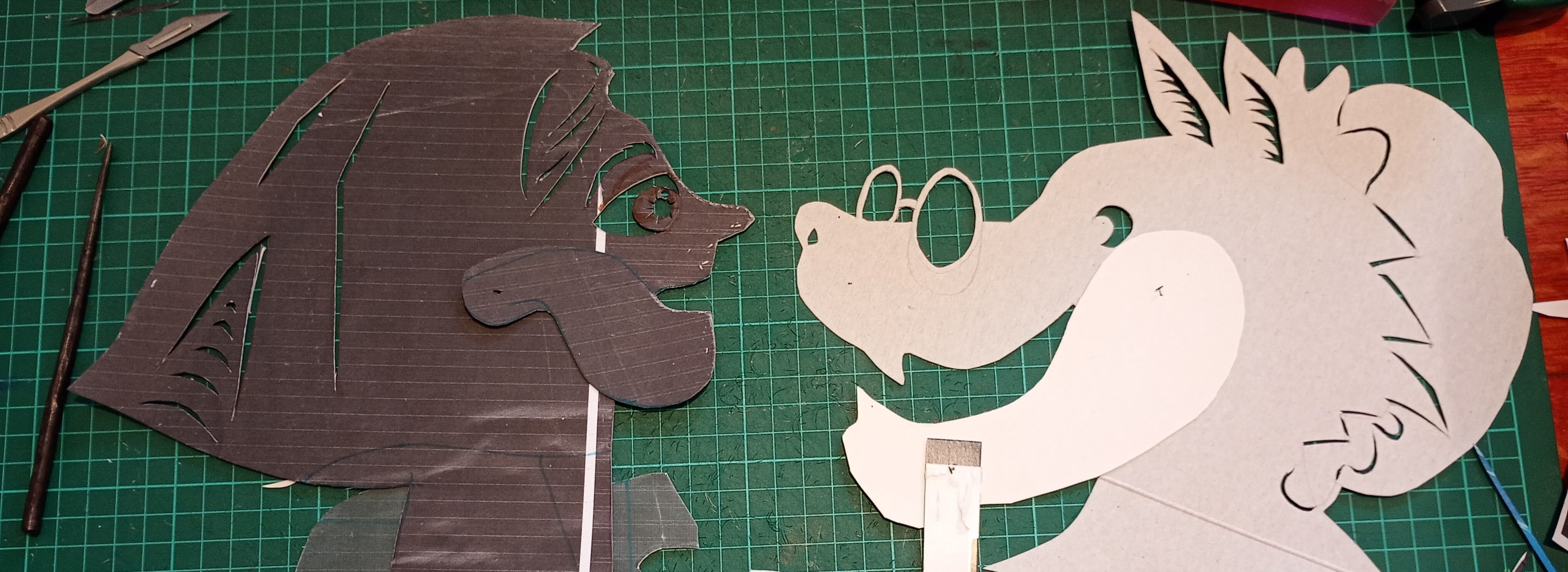 After trying out all of the puppets that I have made so far with the Over-Head Projector and shadow screen I have been working out what extra puppets are needed to tell the stories. In many cases it is different sizes and arrangements of puppets I’d already made. You can see from the pictures that what I have been working on were larger scale articulated versions of Little Red Riding Hood and the Wolf which are to be used directly against the screen itself rather than on the flat bed of the OHP. I have also created a large scale head for Little Red Riding Hood to talk to the wolf, with an articulated mouth, (this is for the “Ooo Grandma what big eyes you’ve got” scene).