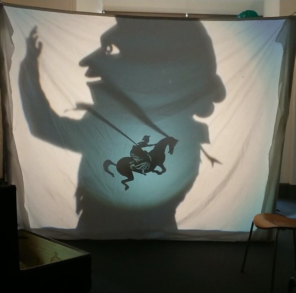 Another reason I love the artform of puppetry is that anyone can make a puppet using cheap materials or even things that would otherwise be thrown away. The main limitation is your imagination and skill, (and skills can be learned and improved through doing and trying things out). A lot of my workshops making shadow puppets use cereal or pizza boxes as this is a perfect thickness to cut out and be sufficiently sturdy to work with. To make a show all you need is a puppet (or a hand if you want to do hand shadows) a light source and a screen (which could be a sheet pegged to a line) or a blank wall.
