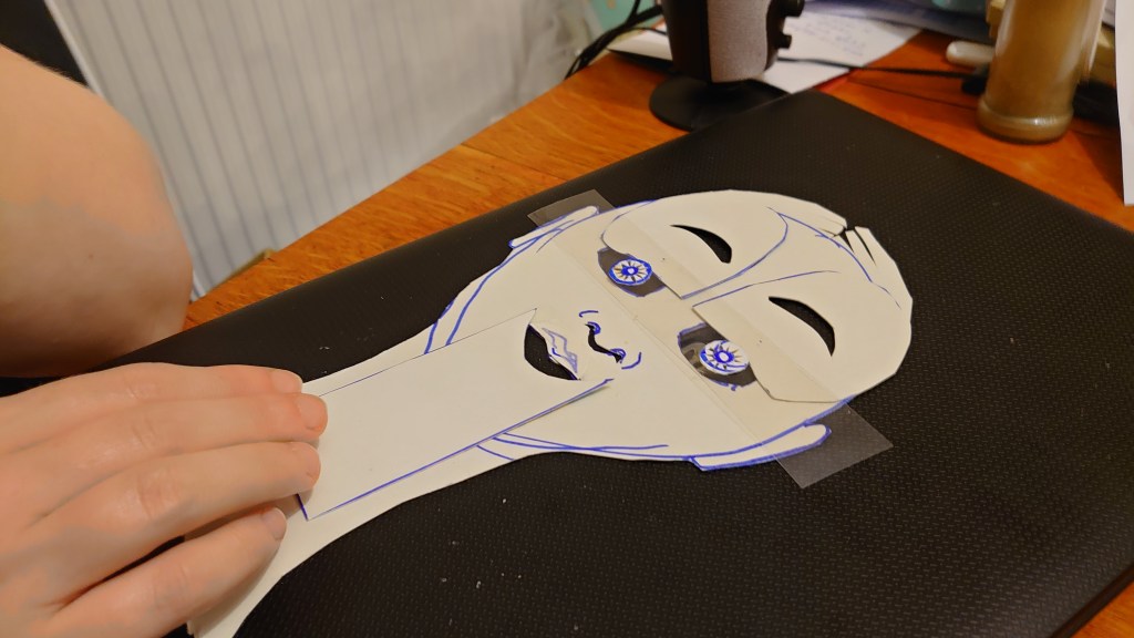 We also were particularly keen to try out a shadow face on the flat-bed of the projector to see what size we would need to make all of the characters faces for what we are calling our “hero-face” puppets. These will be for creating close-up facial expression shots of our main characters and will hopefully have moving eyes, eyebrows and mouth to create a wide variety of expressions. This will hopefully save time on puppet making as we will not need to create a new puppet for each facial expression. We will have “hero-face” puppets for all of the main characters both “face on” and in profile.