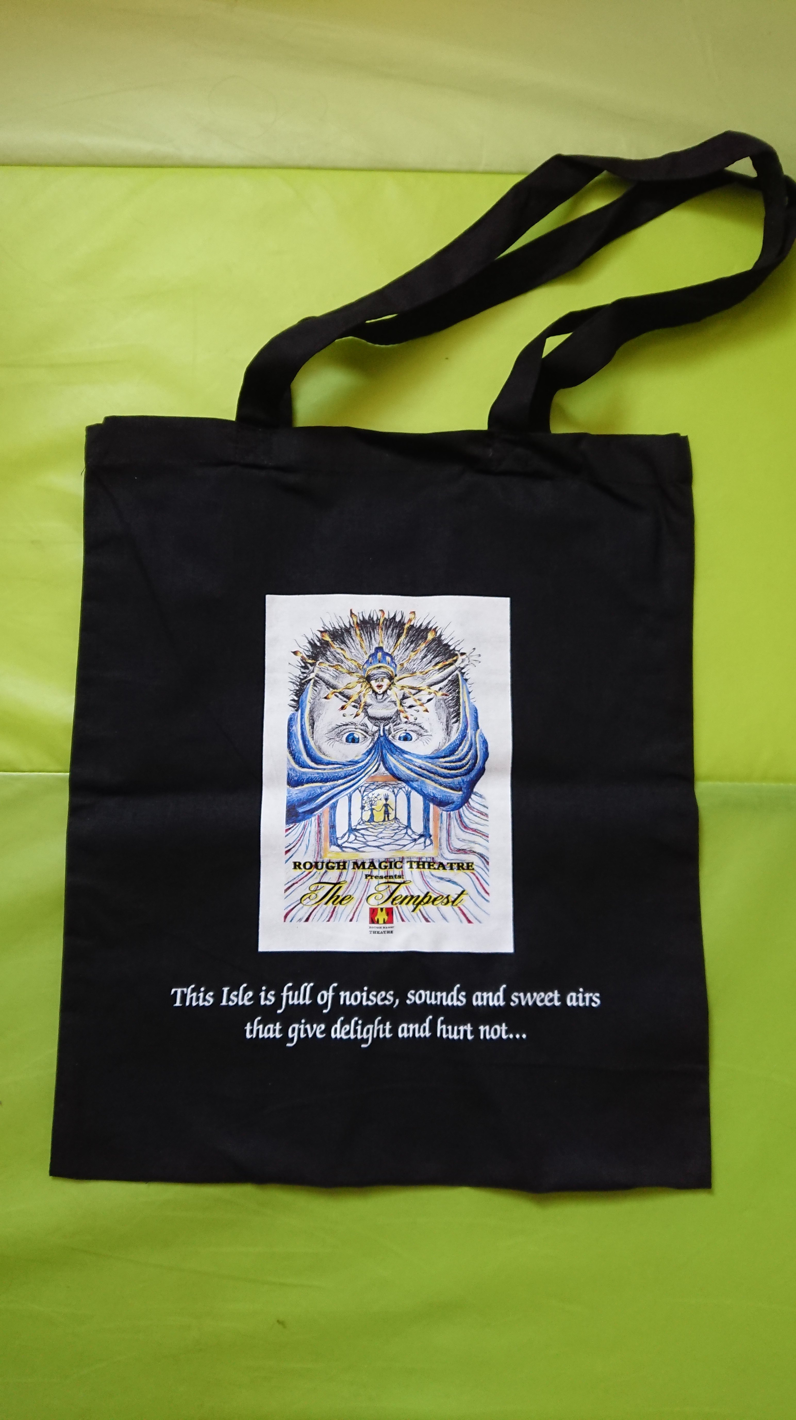 As a birthday present for my brother Peter who originally played both Caliban and Ferdinand in Rough Magic Theatre’s first production “The Tempest” I personalised this black “Tempest” tote bag with a quotation by Caliban from the original Shakespearian text. You can personalise the products in my Spreadshirt shop by pressing the pencil icon. You can add your own text in different fonts, sizes, colours and positions. You could put someone’s name on or add any other message/text that you like. This personalisation option is available on all of the different products in the shop.