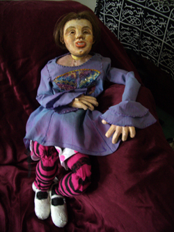 I also brought a variety of different puppet types for them to see and explain how they worked and what countries in the world they came from. As the children had been making glove puppets I mainly showed them some different kinds of glove puppets and we talked about the different hand positions you can use when operating glove/hand puppets and I also brought my Alice Bunraku style puppet to show them as it is probably the most interesting puppet I own. The kids always love seeing how the head goes on and off and has a wig made from my own hair.