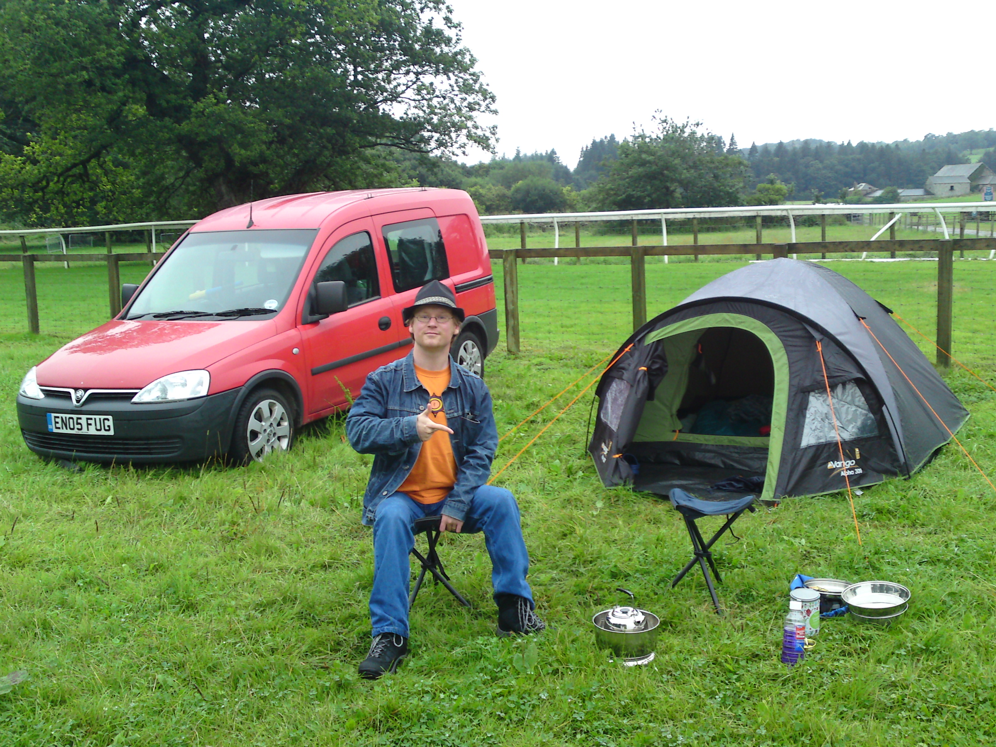 With remarkably little fraying of tempers we succeeded in pitching the tent whilst the weather was temporarily cloudy rather than actually raining. Due to our haste, the tent had one or two wrinkles in the outer skin which I was rather worried might cause a leak in rainy weather, but there was nothing to be done about it. I was extremely glad, due to the sodden nature of the ground that I had bought an extra groundsheet and my wellies with me.