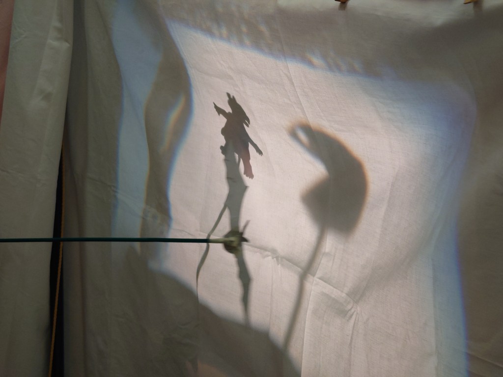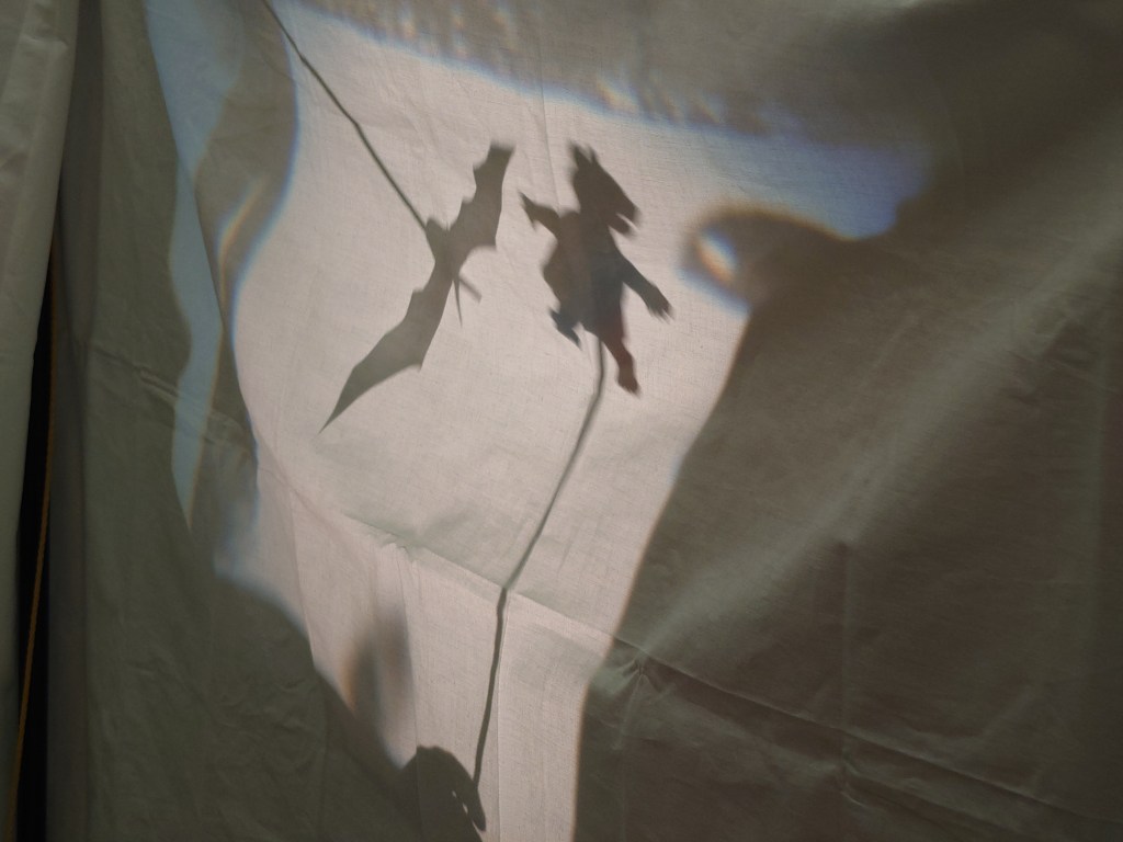 As you can see, we had excellent weather for shadow puppetry as it turned out to be a very sunny day, (that is all using sunlight with no artificial light at all). It is of course possible to do the show in less sunny weather and indeed night time events as I can use my battery powered strip light for that.