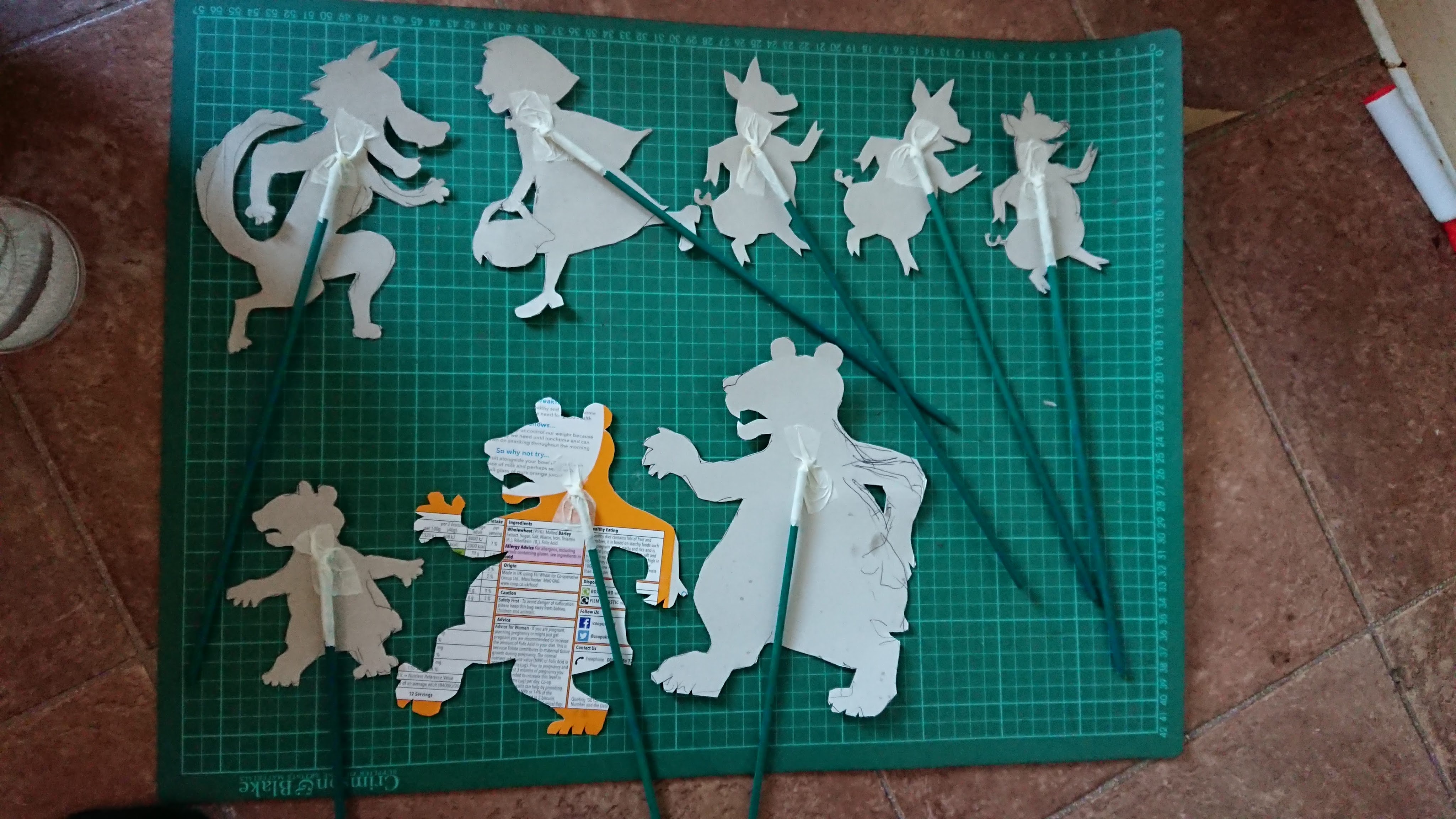 I was asked to do a workshop for children from the most improved readers group which would be children of all ages from across the school. So, I planned something that would allow the younger children to make simpler insect themed puppets based on the design I came up with for workshops at Buxton Puppet Festival and allow the older children to make more complicated drawing and cutting out, silhouette type puppets. I also created a set of basic fairy tale based puppets out of recycled cereal packet card for the kids to have a play with and give them ideas. The teachers seemed very pleased and thought that the children had all enjoyed themselves very much.