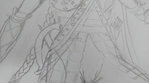 She has a broadsword and a crossbow which presumably have been reclaimed from an old country house or a museum collection.  Bones of cows would be an abundant resource to make things out of so we decided to stick a cow skull on her shoulder for added intimidation factor.
