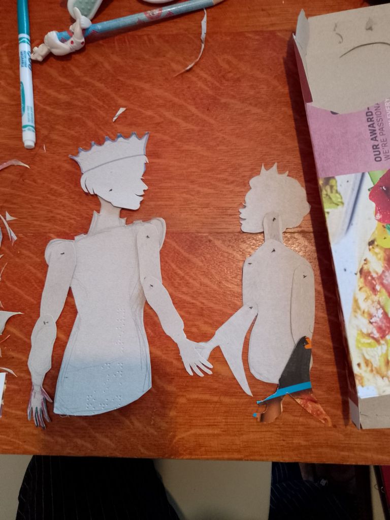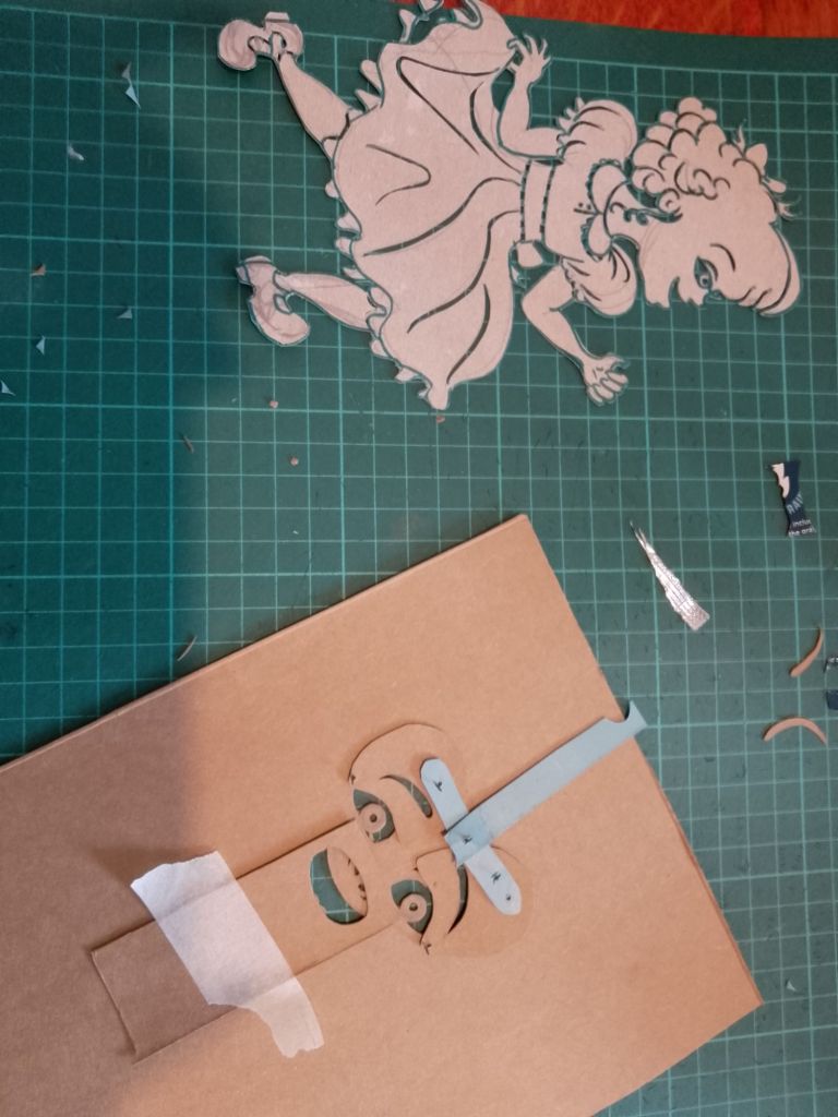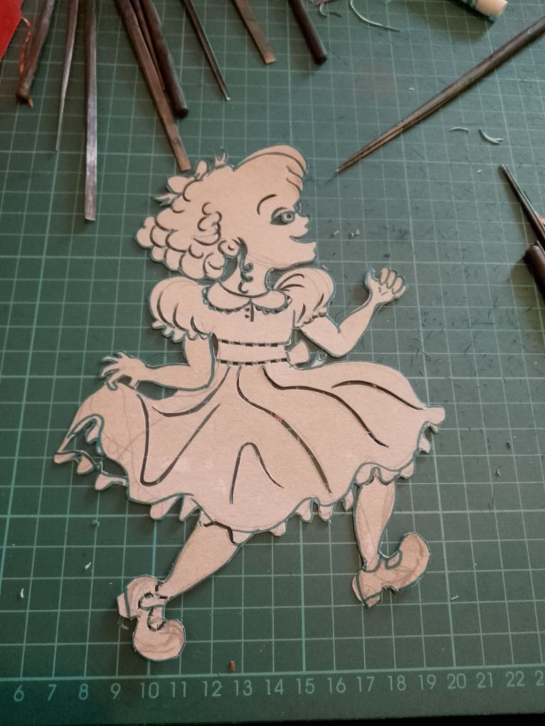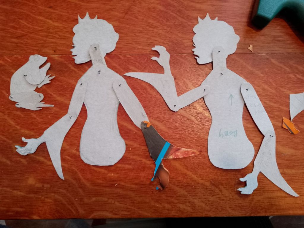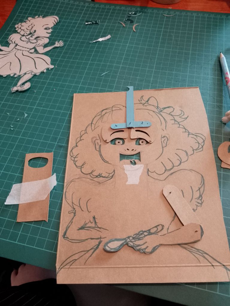 After trying out all of the puppets that I have made so far with the Over-Head Projector and shadow screen I have been working out what extra puppets are needed to tell the stories. In many cases it is different sizes and arrangements of puppets I’d already made. You can see from the pictures that what I have been working on were larger scale articulated versions of Little Red Riding Hood and the Wolf which are to be used directly against the screen itself rather than on the flat bed of the OHP. I have also created a large scale head for Little Red Riding Hood to talk to the wolf, with an articulated mouth, (this is for the “Ooo Grandma what big eyes you’ve got” scene).