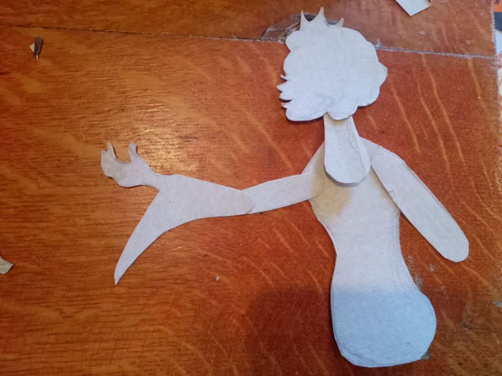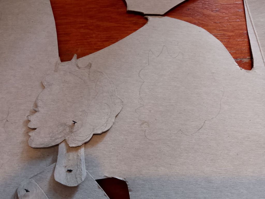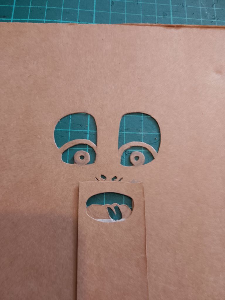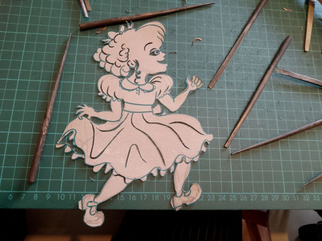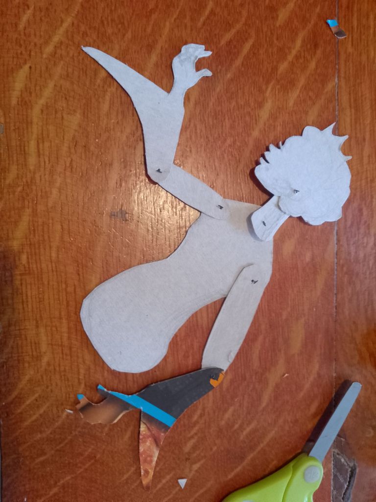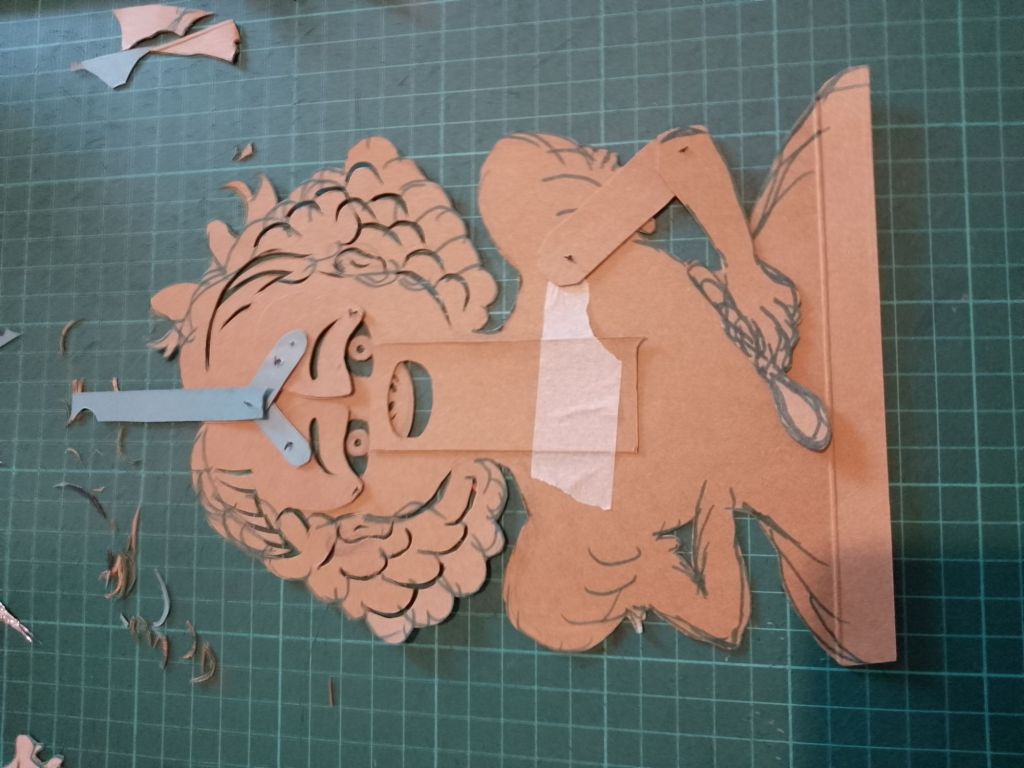 After trying out all of the puppets that I have made so far with the Over-Head Projector and shadow screen I have been working out what extra puppets are needed to tell the stories. In many cases it is different sizes and arrangements of puppets I’d already made. You can see from the pictures that what I have been working on were larger scale articulated versions of Little Red Riding Hood and the Wolf which are to be used directly against the screen itself rather than on the flat bed of the OHP. I have also created a large scale head for Little Red Riding Hood to talk to the wolf, with an articulated mouth, (this is for the “Ooo Grandma what big eyes you’ve got” scene).