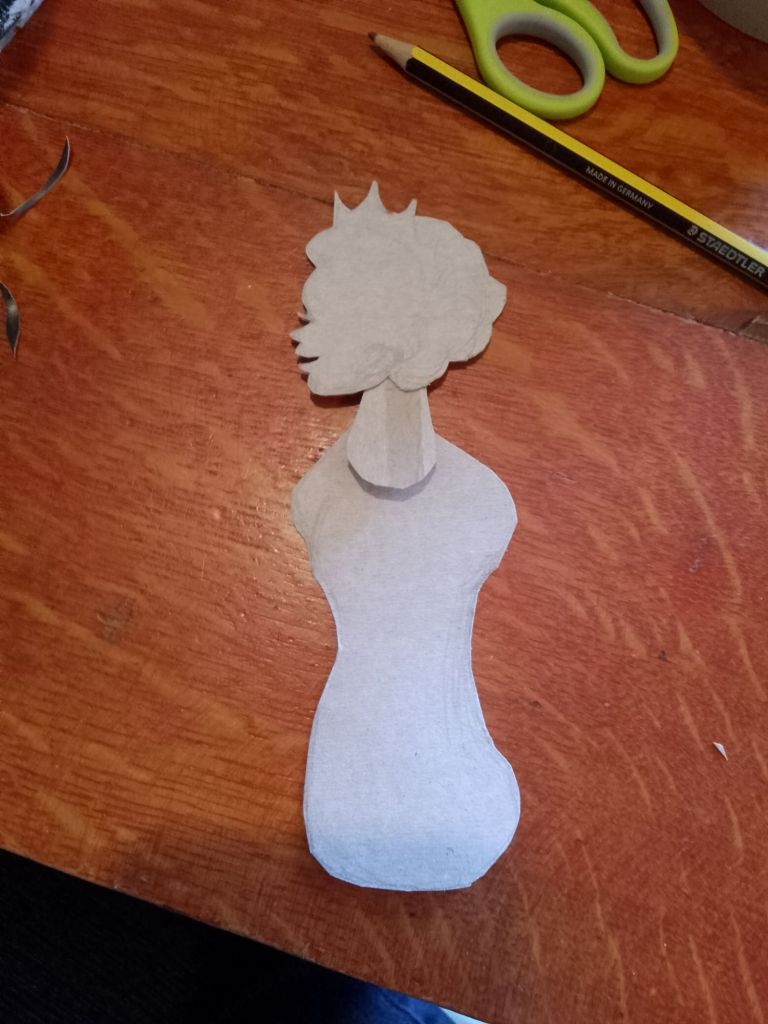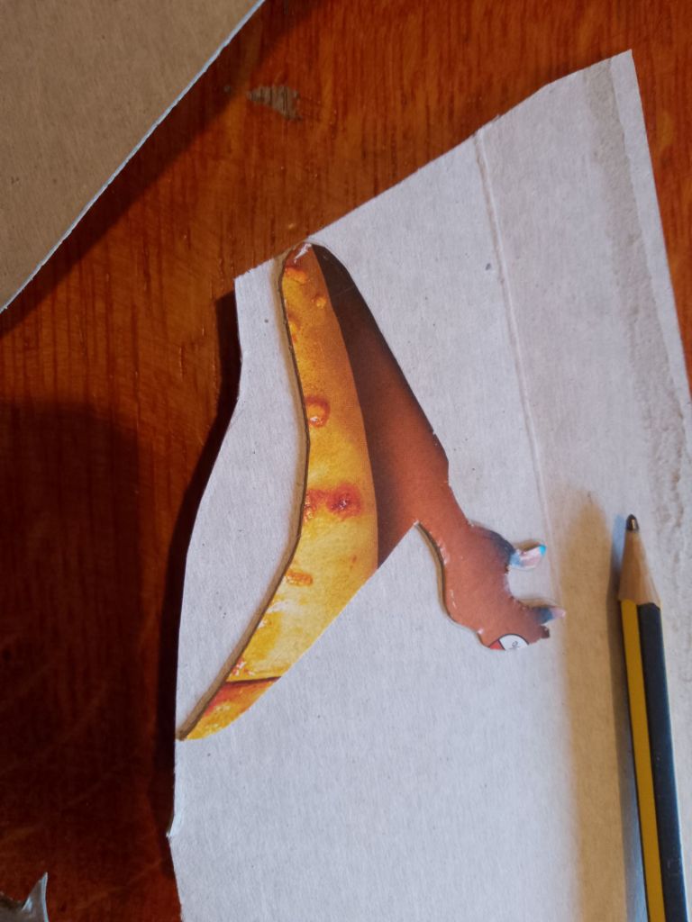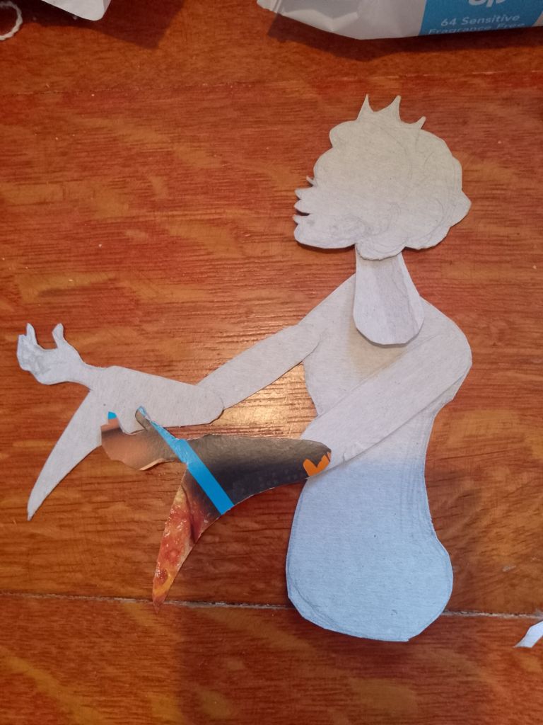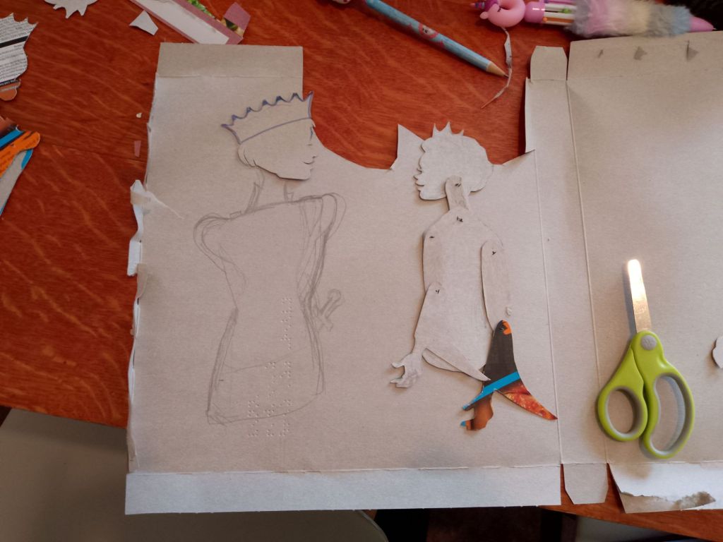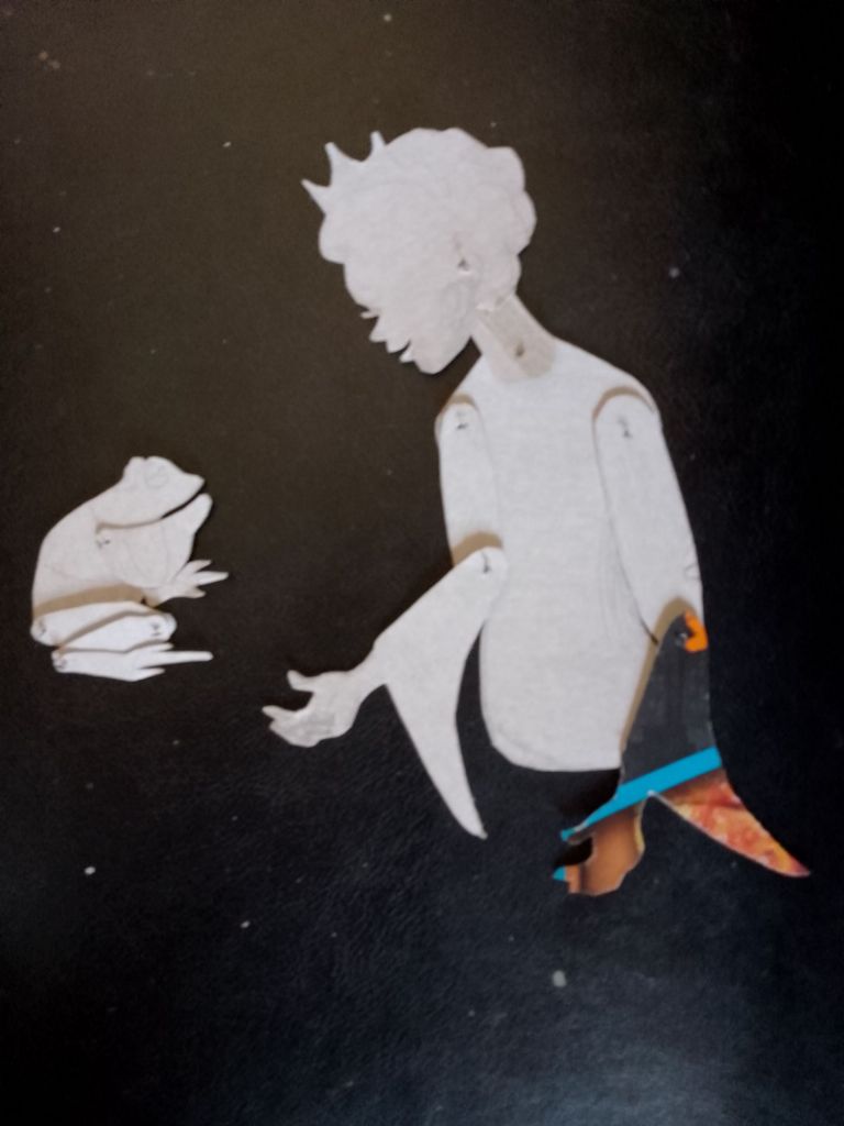 After trying out all of the puppets that I have made so far with the Over-Head Projector and shadow screen I have been working out what extra puppets are needed to tell the stories. In many cases it is different sizes and arrangements of puppets I’d already made. You can see from the pictures that what I have been working on were larger scale articulated versions of Little Red Riding Hood and the Wolf which are to be used directly against the screen itself rather than on the flat bed of the OHP. I have also created a large scale head for Little Red Riding Hood to talk to the wolf, with an articulated mouth, (this is for the “Ooo Grandma what big eyes you’ve got” scene).