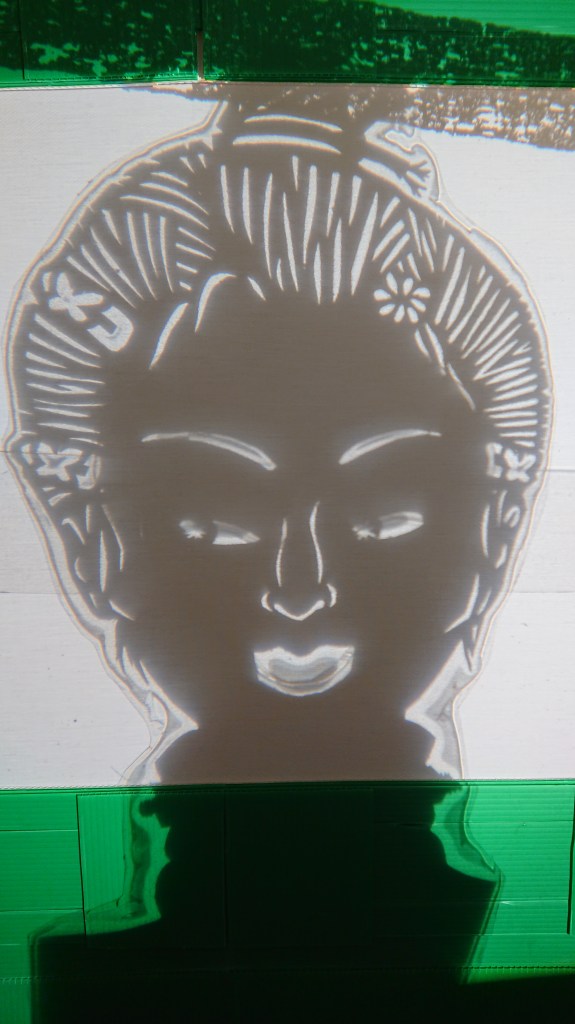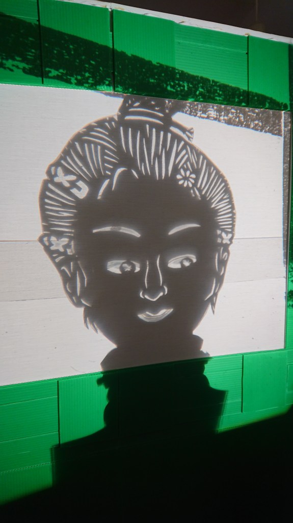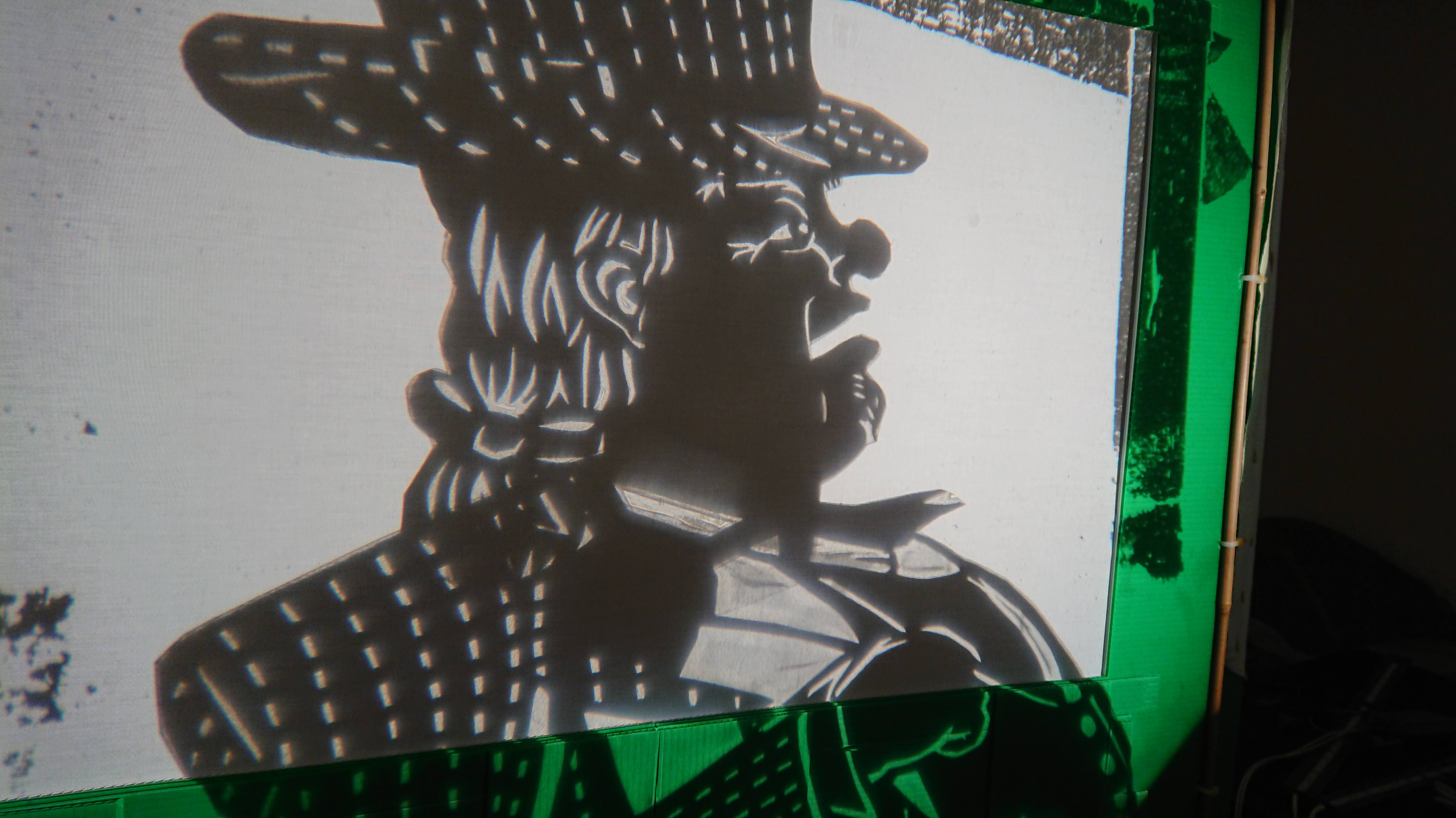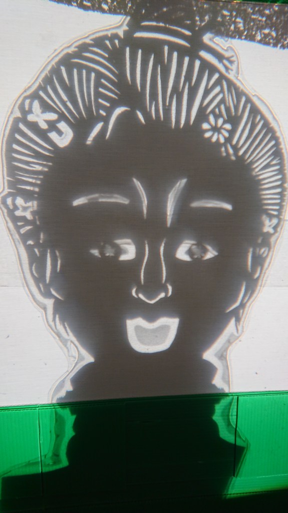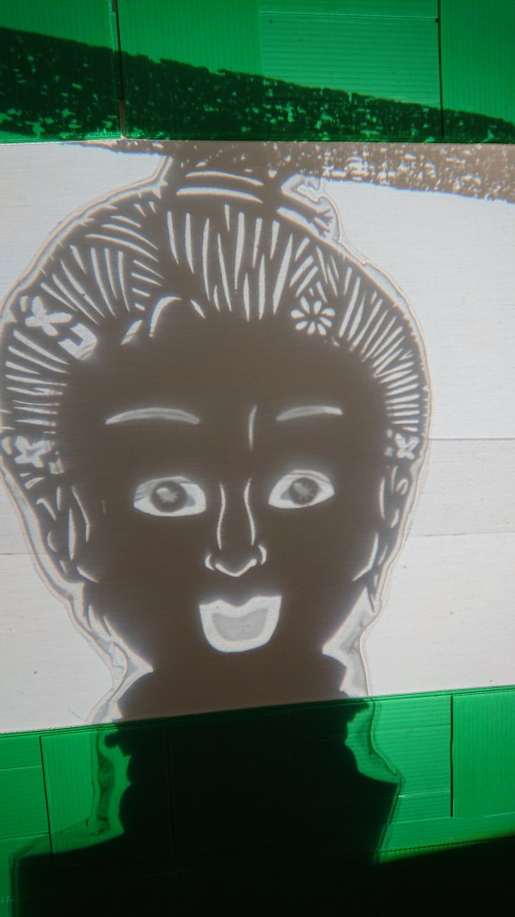 This video shows a practical experiment at how the front facing “hero faces” will work. We used the “Jabberwocky” poem from our shadow puppet suitcase show for this lip-synch experiment as it is something Tim and I already know off by heart. Tim is controlling the mouth movement and I am doing the eyes/eyebrows. This is not the voice or the words we will actually be using for the Artura character in the finished show. We saw from this that the design for this “hero face” does actually work and so forged ahead with making more for the other main characters that will need re-usable hero face puppets like this.