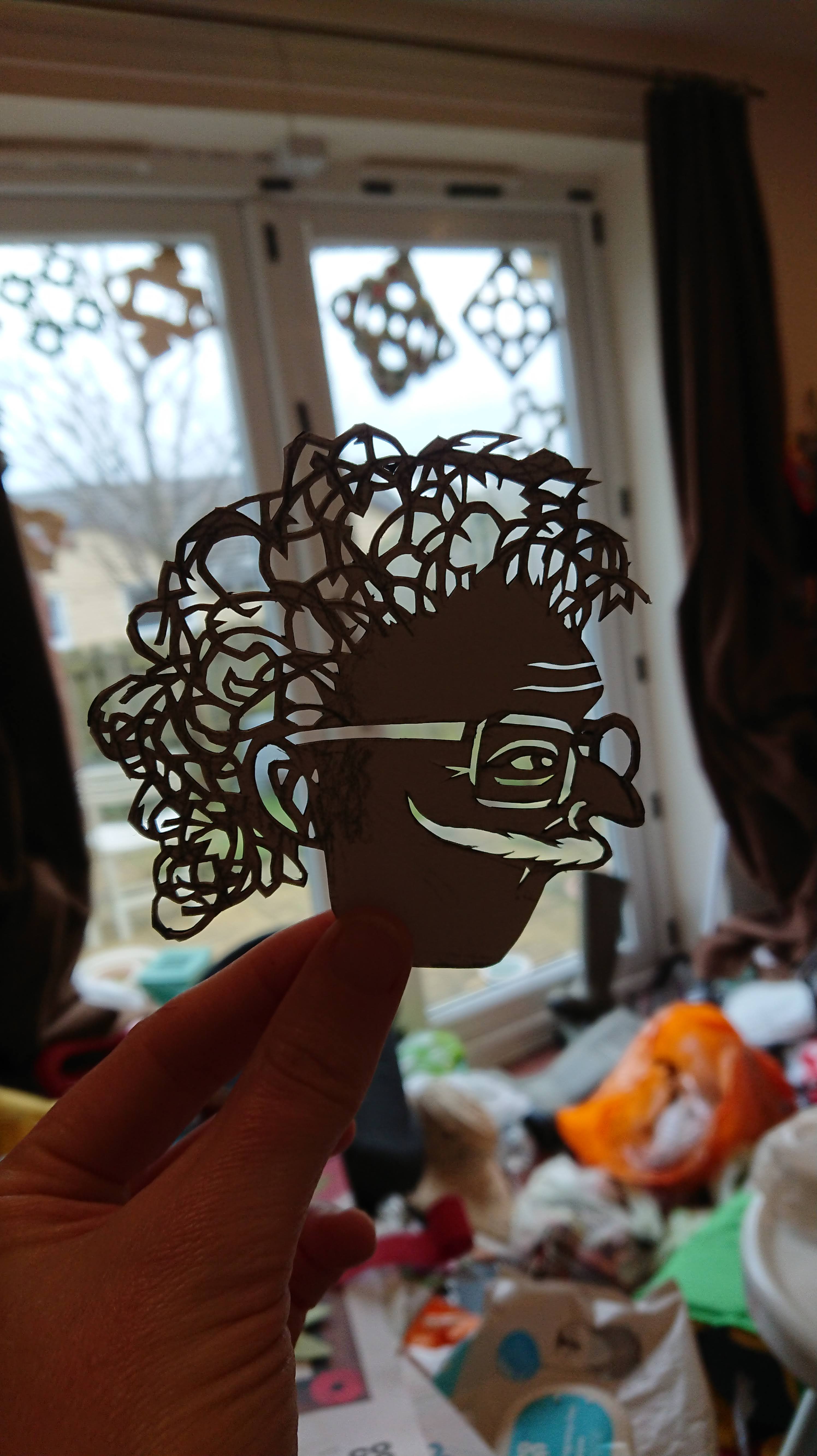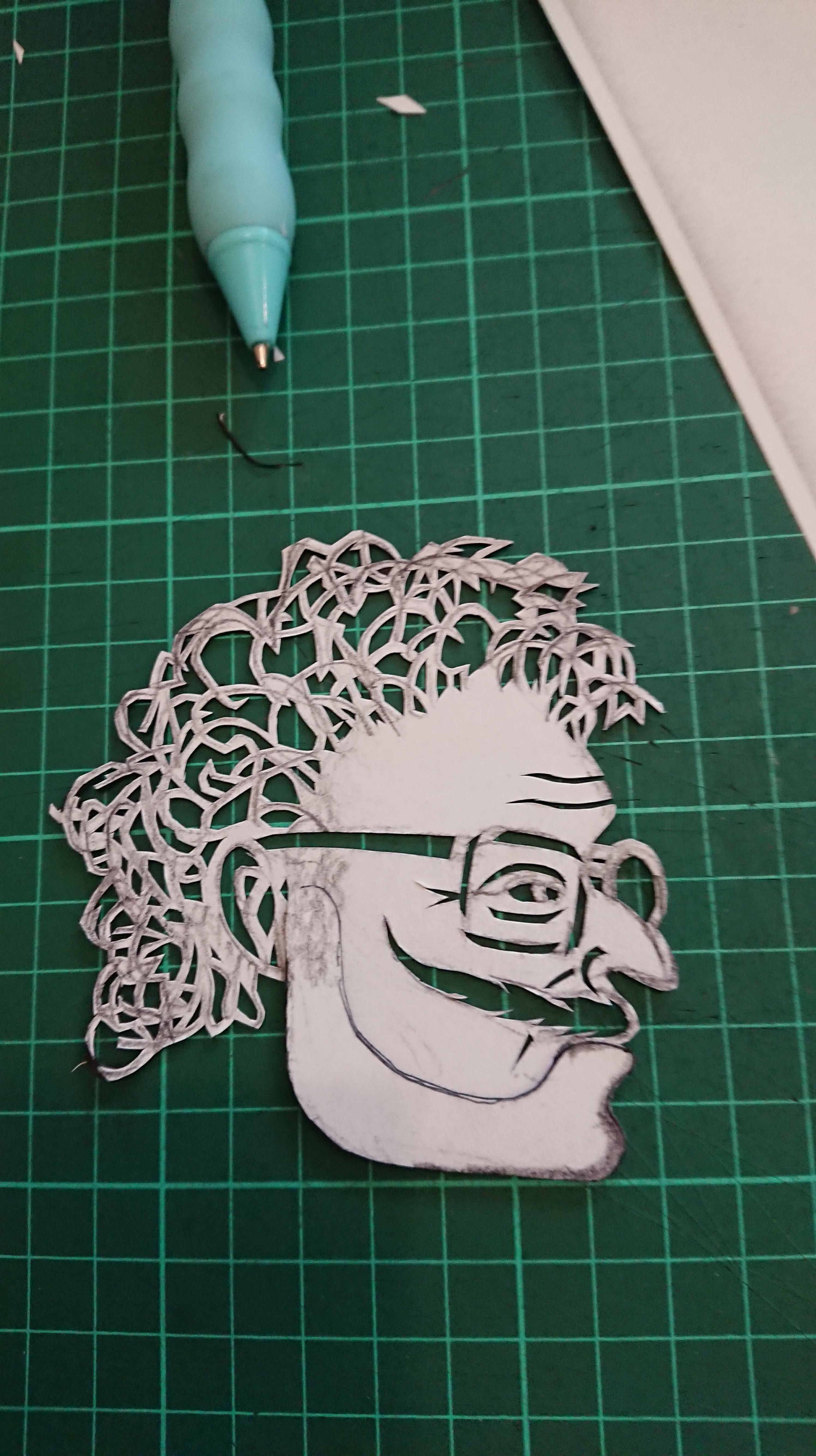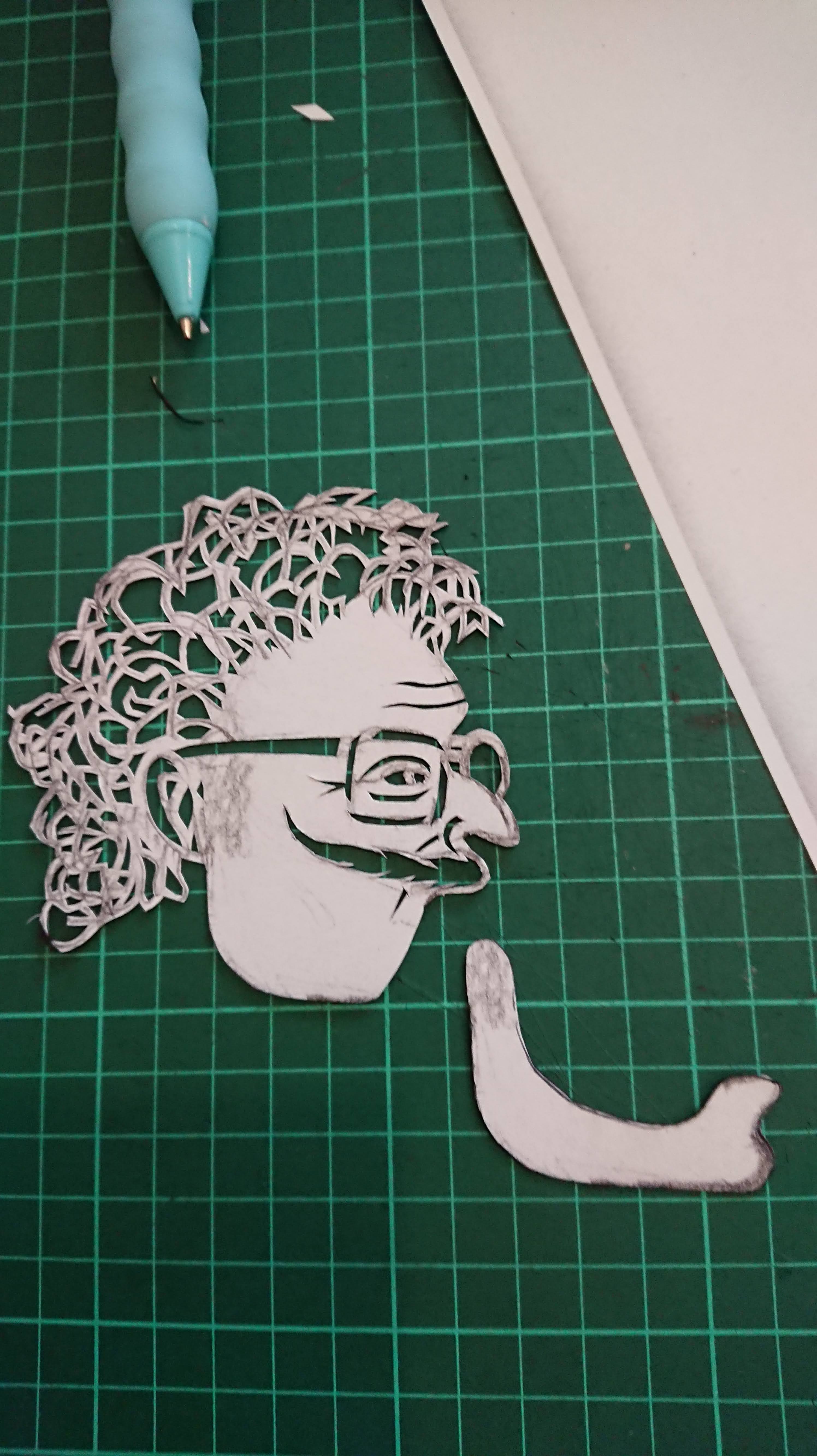 I was completely happy with my original drawing of the head for “Our Hero” (otherwise known as the mystery solving librarian or “Secret Keeper” from the title of the series). This is his “at home” lounging round the house look. I managed to blow up the image on my copier so that it was exactly the right size relative to the “in profile” Prime Minister puppet.