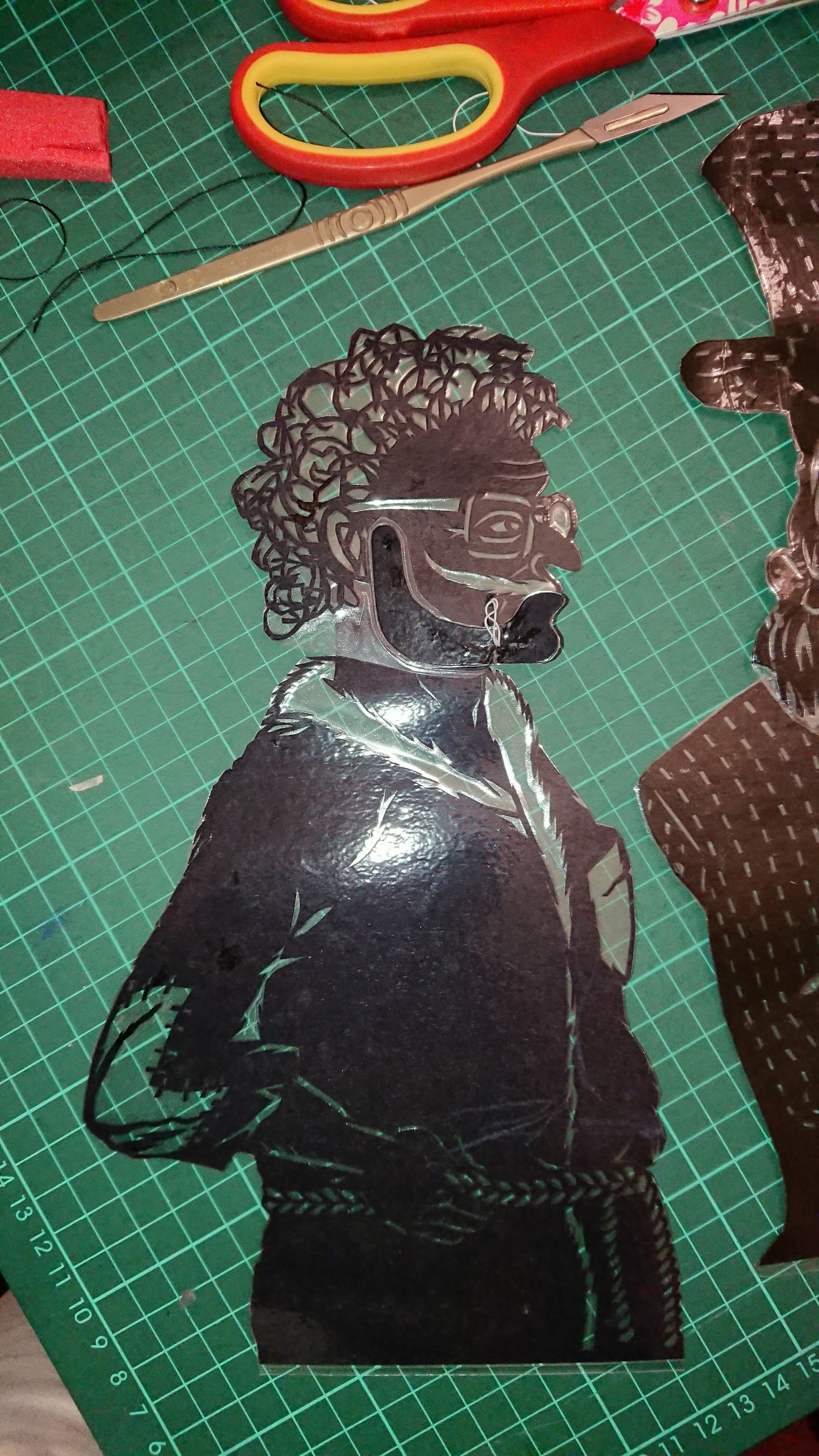 I decided that “Our Hero”‘s character called for a more upright stance than the Prime Minister so decided to create a head nodding action in a different way. The Prime Minister has a head and neck joined together and the whole neck pivots forward and backward on the body. This time I made the decision to have a rigid neck with the head pivoting forward and backward on the neck (I hope that makes sense – if not look at the pictures). It made it a little more challenging to join the joints on the jaw and neck as the pivot points for both were quite close together. I am creating the joints using thick thread (the same kind as I use for the joints on the miniature shadow puppets in my Shadow Puppet Suitcase shows) which is knotted on both sides of the joint.